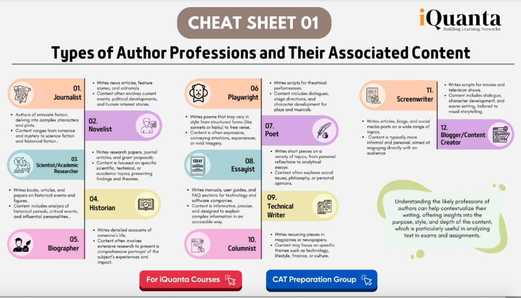 The VARC cheat sheet has all important aspects for the Verbal Ability and Reading Comprehension section in CAT. It has various aspects such as common author tones, types of author professions and their associated content, literary devices, best practices for vocabulary skills and more. Join the whatsapp group to get the VARC cheatsheet.