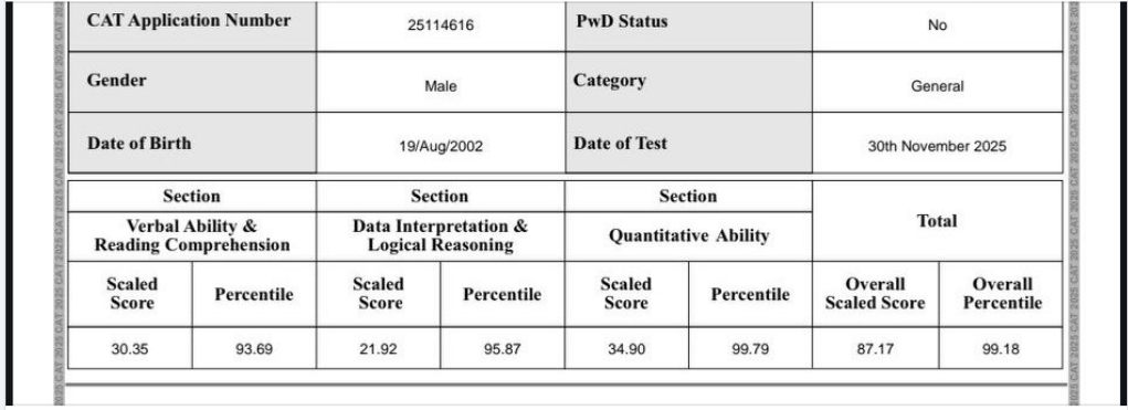 “CAT 23 -29 percentile .Didn’t even score a single answer correctly(I think..I don’t even remember). I thought CAT hamara bas ki bath nahi hain. But I gave CAT in 24. CAT 24- 88 percentile.. I thought I could do better as 2024 paper was damn easy and I screwed it up without a proper preparation. Cut it to CAT 25 – 99.18 percentile. I prepared like I used to do in my 12th for JEE MAINS with my jobI still remember coming out of the exam hall hiding my tears. LRDI was pretty messed up.. I was completely clueless for the next 2 days. The response sheet and score card reminded me my journey. I always thought 99 is way above my preparation and knowledge..It’s actually our mental preparation that takes us to that spot So…