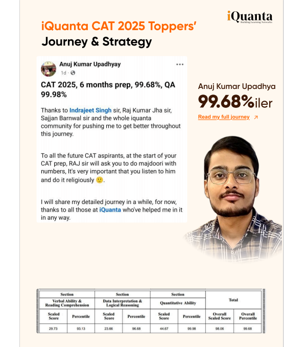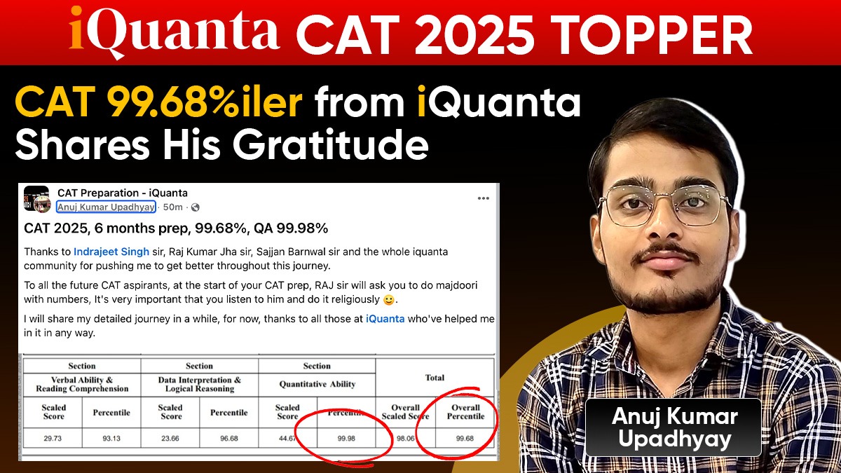 CAT Topper: Common Admission Test is one of the main entrance examinations in India to secure admission in the top business schools. Today we are covering very inspiring journey of a CAT topper who secures an overall 99.68%ile in just 6 months of CAT preparation with iQuanta. This entire journey is a great example of consistency, dedication, and hardwork along with competing across pool of aspirants to get an amazing percentile across each section of the CAT exam and especially in Quantitative Ability which is 99.98 percentile. Let’s discuss the inspiring journey of a CAT 2025 topper Anuj Kumar Upadhyay and the role of iQuanta during his CAT preparation.