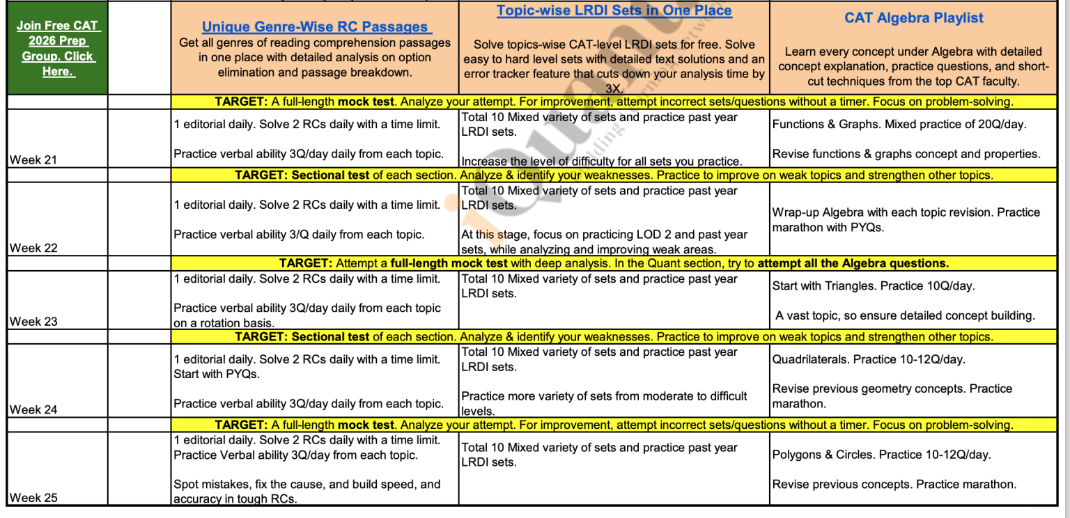 To understand the concern, we have prepared a detailed study time-table PDF to streamlined your beginning for CAT 2026 with full of confidence. Please find the button specified below.