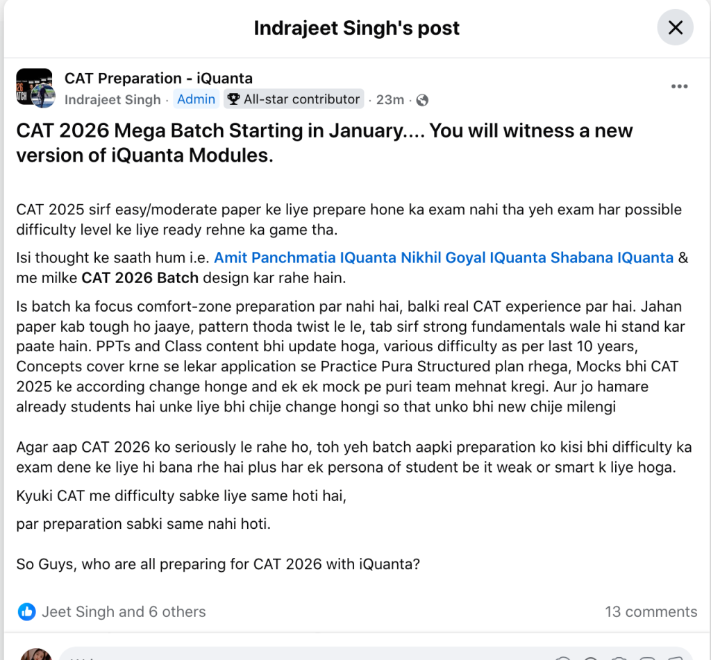 So Guys, who are all preparing for CAT 2026 with iQuanta? Check the complete post below and comment on the post!