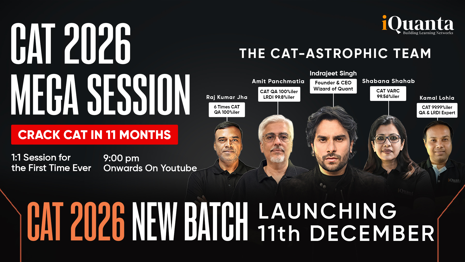 If you are a CAT 2026 aspirant and worried about your preparation journey then you are at the right place. Every year more than 2 lakh students appear for CAT exam but only 5000 land up getting into top B-Schools in India which is just 2.5%. So if you want to be amongst that 2.5% of students then you need to start your preparation from now with the right strategy. To clear all your doubts and dilemmas about CAT 2026 iQuanta is organizing a mega session on CAT 2026 where you will get the complete roadmap and strategy for your preparation. You will also get one on one mentorship from the top CAT experts – Indrajeet Sir – Wizard of Quants, CEO and Founder at iQuanta, Amit Panchmatia Sir – CAT QA 100 percentiler and LRDI 99.8 percentiler, Shabana Ma’am – CAT VARC 99.56 percentiler and many other top mentors. This CAT 2026 mega marathon on Dec 11, 2025 is free for everyone and will start from 8 PM onwards.