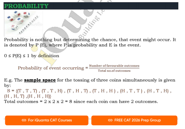 The topics that you will be well equipped with by using the CAT 2026 Modern Maths formula Book PDF are Probability and Permutation & Combination. “Probability” is an evergreen concept that majorly asked across most of the competitive examinations which are highly focused on aptitude and problem solving. Probability is the mathematics for calculating the occurrence of random events across all possible cases whether it is a about playing cards, solving dice problems and whether talking about the famous “Bayes Theorem”. This is widely categorized as an evergreen concept that is indirectly helpful for major applications of Data Interpretation & Logical Reasoning.