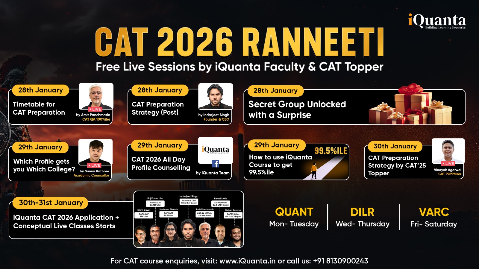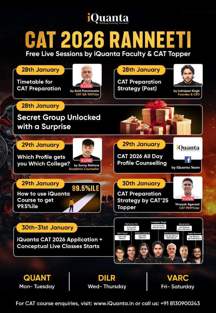 iQuanta has launched its 2026 and it will start its class from January 30, 2026. But before this to gear up and prepare you even before your real preparation begins we are ogranising CAT 2026 RanaNeeti. All the sessions of CAT Ranneeti by iQuanta are free for all aspirants. Whether you are just starting, already preparing or thinking to prepare, this event is your very first step that will take you closer to your IIM dream. The session will be taken by India’s top CAT faculty, mentors and CAT toppers. CAT 2026 RanaNeeti starts from today – January 28, 2025. Check the detailed schedule here: