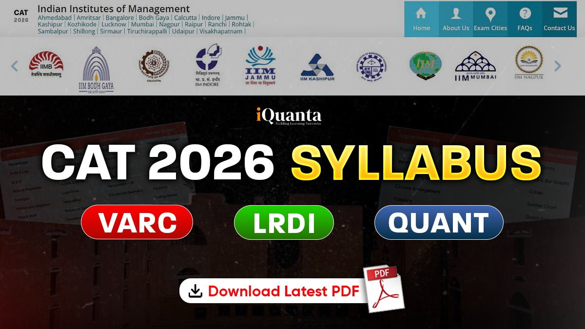 Approximately 9 months are left for the Common Admission Test which is India’s top most management exam. The very first thing one should know is the CAT 2026 syllabus. The exam has 3 sections – Quantitative Aptitude, Logical Reasoning and Data Interpretation and Verbal Ability. The official syllabus for CAT 2026 exam is not released by the authorities but based on the pattern and trends we have the latest syllabus pdf. The latest CAT syllabus 2026 pdf has been released by iQuanta. Caselets, reasoning based DI, Quant Based reasoning are the most important topics with highest weightage of LRDI CAT 2026 syllabus. Topics such as Time Speed Distance, Sequence & Series, Logarithms are the high weightage topics of Quants CAT syllabus. Science and technology, Philosophy, Business and Economics are high weightage RC genres of the CAT VARC syllabus.