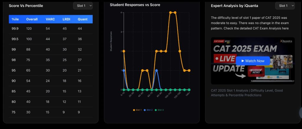 After the CAT exam, students may have a lot of questions to ask. They want a rough idea of their performance and some clarity on scores. The CAT Percentile Predictor can reduce their anxiety. It helps them plan their next move in the MBA journey much earlier. The iQuanta CAT 2025 Score vs Percentile Tool is simple and trusted by many aspirants. It adjusts for slot difficulty and historical trends. This makes it one of the best predictors available.