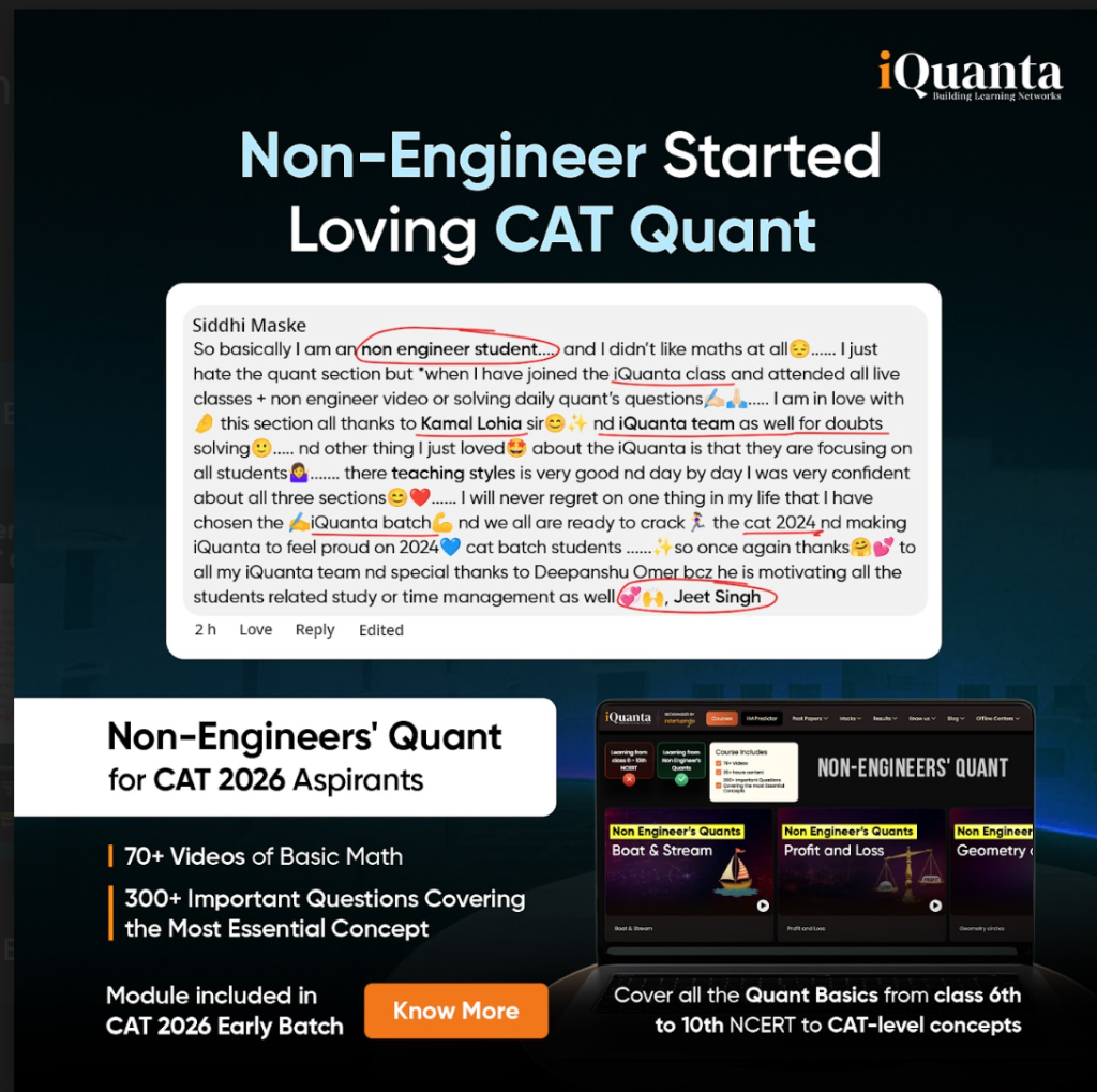 There are times when you may not solve all the questions accurately. All you need is conceptual clarity. You can either learn it from your mentors or join the iQuanta CAT 2026 course. This program offers the Non-Engineer’s Quant Module. It covers fundamentals from class 6 to 10th NCERT to CAT-level concepts. Once you learn the basics, solve 30-40 questions related to that particular topic. This can boost your confidence and build your foundation from the ground up.