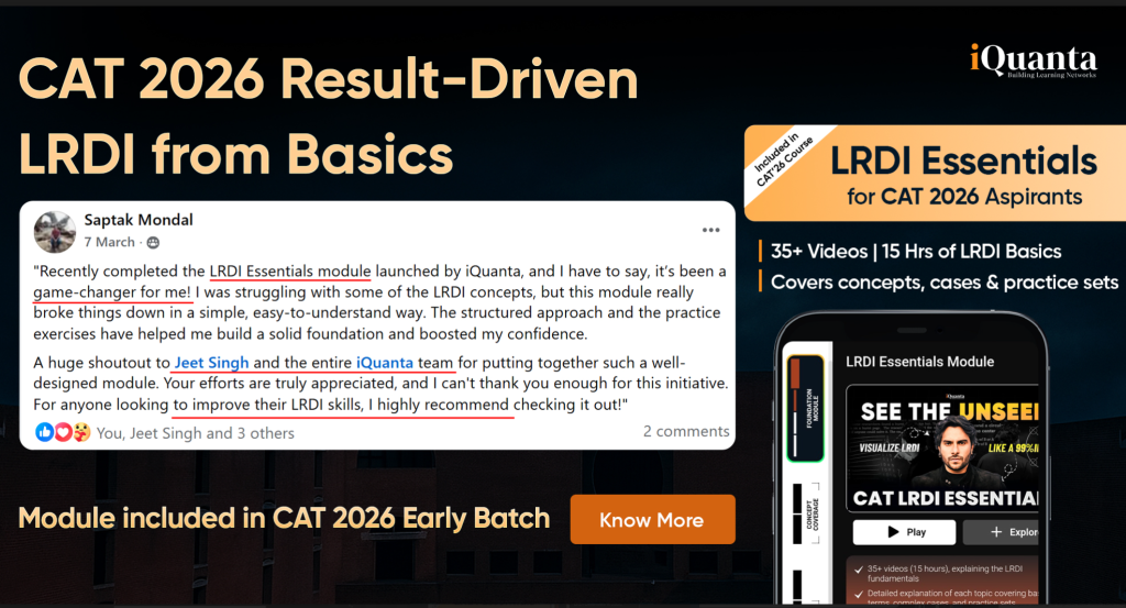 Many students may not be able to solve past papers before 2016 due to poor concepts. If you are struggling with fundamentals, check the LRDI Essentials Module in the iQuanta CAT 2026 course. It helps you learn the basics from scratch across every topic. This simplifies your question-solving approach and advances your preparation.