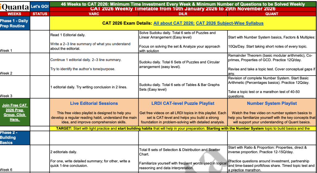 The detailed 11 months study time-table by iQuanta help candidates in CAT preparation due to aligned strategy. The PDF covers week-wise detailed plan across Verbal Ability & Reading Comprehension, Data Interpretation & Logical Reasoning and Quantitative Ability. The PDF is aligned with the detailed study plan in such a manner so that candidates will able to access the other free resources as per specified with the flow. For example, candidates can also opt for the best books for CAT preparation to cover CAT-level questions alongside learning concepts in classes. Candidates can download the detailed study time-table by clicking on the button specified below.