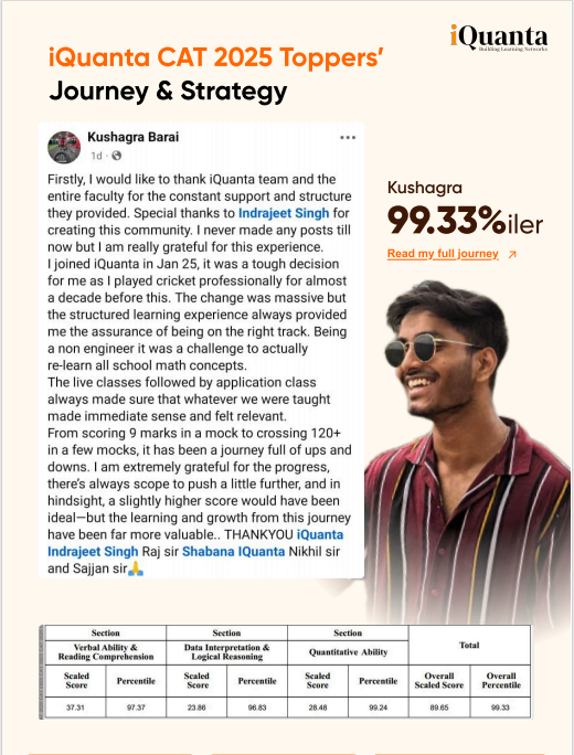 CAT 2025 Topper Kushagra Barai, who secured an amazing 99.33 percentile overall, is a true example of how structured guidance and consistent effort can lead to exceptional results. After transitioning from a professional cricketing career to full-time CAT preparation, Kushagra joined iQuanta in January 2025 and navigated the challenges of being a non-engineer with focused mentorship, live conceptual learning, and application-based practice. His journey reflects the impact of a disciplined preparation strategy, continuous support from expert faculty, and a collaborative learning community, making his success story both inspiring and insightful for aspirants aiming for CAT 2026. This blog is an inspiring journey of a CAT topper Kushagra Barai.