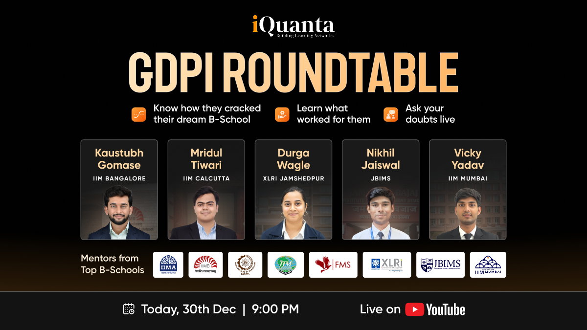 If you have cleared the CAT 2025 exam then this is just half the battle and in order to conquer it, you will now have to prepare well for GD-PI and crack it. Many CAT 99 percentilers have missed their chance of securing a seat at their dream b-school as they did not do well in their GD-PI round. You might lose out on your chance at top IIMs due to poor strategy or limited guidance for CAT GD PI. Therefore, to help out all MBA aspirants, iQuanta will be conducting a GDPI by mentors from top b-schools such as IIM Bangalore, IIM Calcutta, XLRI Jamshedpur, IIM Mumbai and JBIMS. These mentors will share their GD-PI experiences and what helped them crack GD-PI for MBA admission. They will also share the detailed strategy and common mistakes to avoid during the group discussion and personal interview.