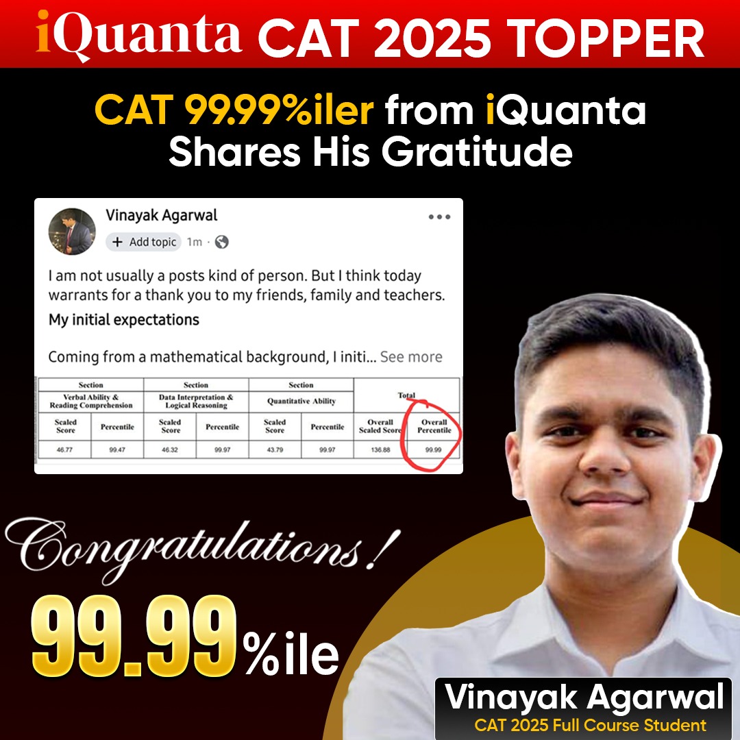 CAT Topper: This blogs covers the detailed journey of a CAT 2025 topper “Vinayak Agarwal” who scored an amazing 99.99%ile in CAT 2025 and is a iQuanta student. Let’s see his CAT preparation strategy in a detailed manner.