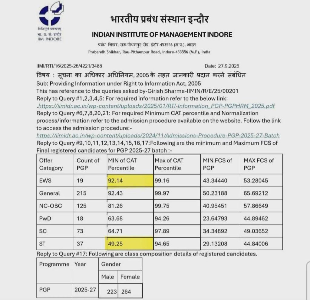 The latest RTI data from IIM Indore has raised eyebrows. ST students in the 2025-27 PGP batch secured admission at just 49.25 percentile. General category candidates needed 92.43 percentile to gain entry. The gap is huge. It gets everyone talking about fairness and opportunity. Reservations clearly make a difference here. Critics raise questions about merit and fairness. While others say that a reservation is needed to support historically disadvantaged communities. The debate continues over how top B-schools should balance merit, fairness, and equal representation in PGP admission.