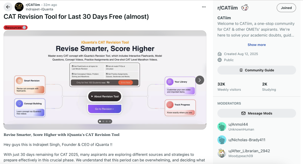 iQuanta Founder, Indrajeet Singh who is also popularly known as the “Wizard of Quant” among the CAT aspirants is now on the Reddit community r/CATiim. To make your last-mile CAT preparation simpler and more effective, Indrajeet sir is introducing India’s First CAT Revision Tool, where you’ll find everything you need to focus on during the final 30 days before the exam.