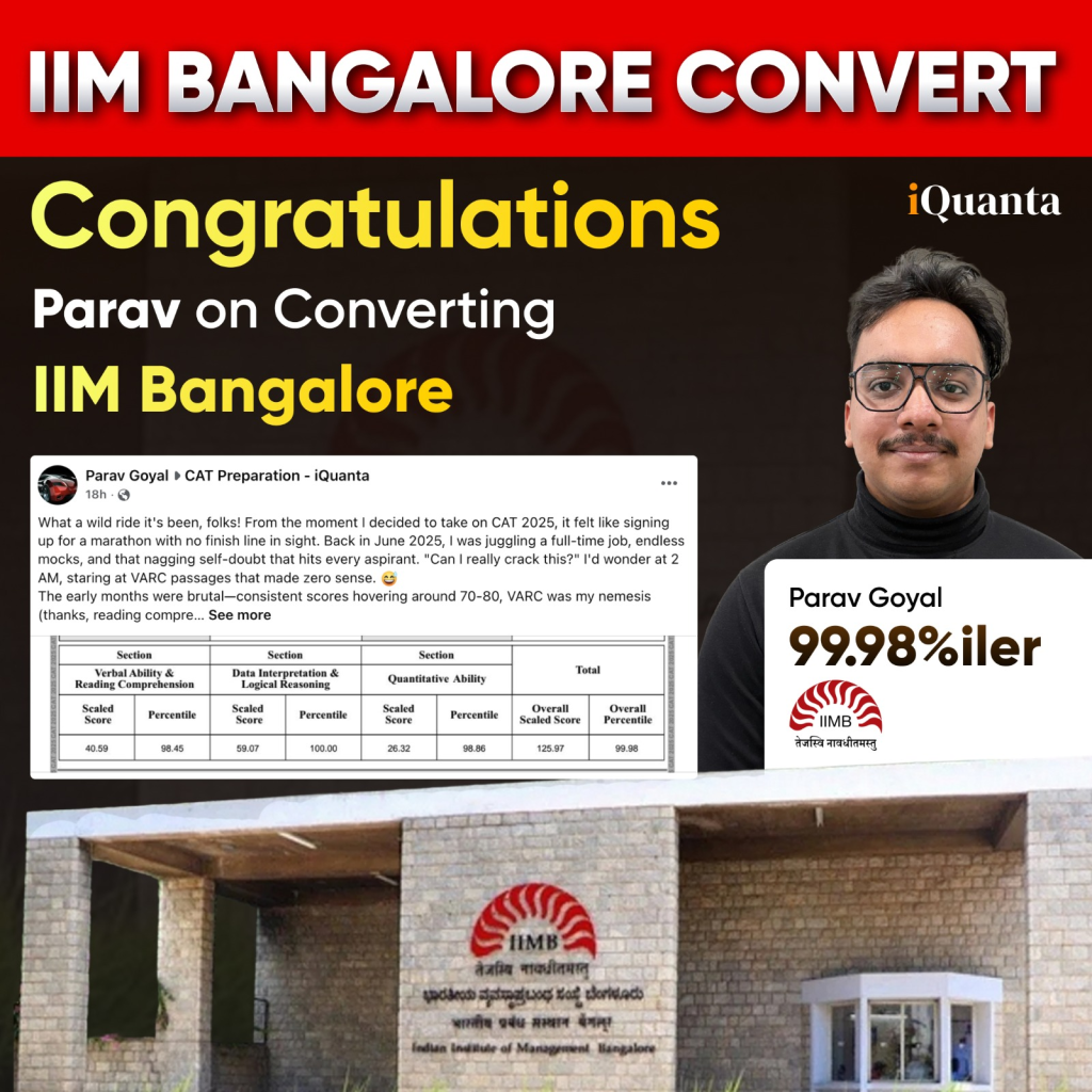 CAT Topper:Â IIM Bangalore has recently shared their final results and iQuanta’s student Parav Goyal has successfully converted IIM Bangalore. CAT exam is one of the important examination to pursue management from the top B-schools in the country. We have an inspiring journey of a CAT 2025 topper who got an amazing 99.98 %ile with the full dedication, consistency and hardwork.This examination possess great difficulty level due to the pool of aspirants appeared in the exam with different academic background.