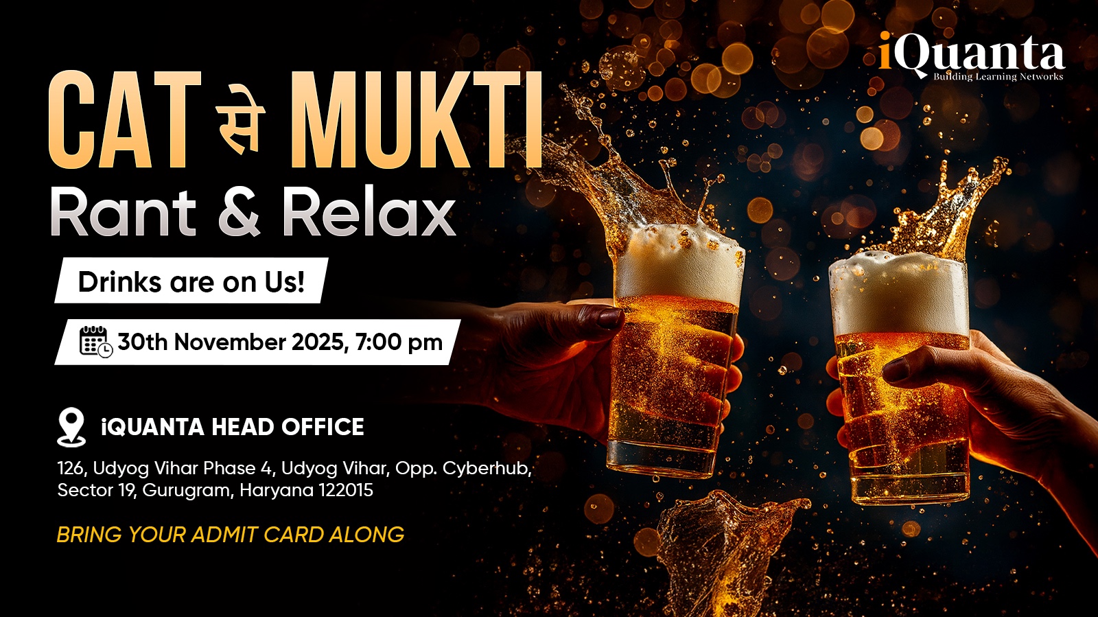 Welcome to the CAT se Mukti Party!!! 🥳- A moment to celebrate your effort, success and consistency. Come together to celebrate with chilled beer and scenes at iQuanta headquarters. Speak your heart out, dance, have fun and chill throughout🕺🏻💃🏻 after CAT 2025. Let your inner child experience the celebration with mind-blowing energy. The moment you step into our kingdom, the most heartwarming lines will welcome you with open hearts ~ Drinks are on Us – 7:00 PM onwards 🍻 Our team will celebrate your efforts with unlimited fun, endless laughs, beer and not to forget – mouth-watering food too 🍕🍺
