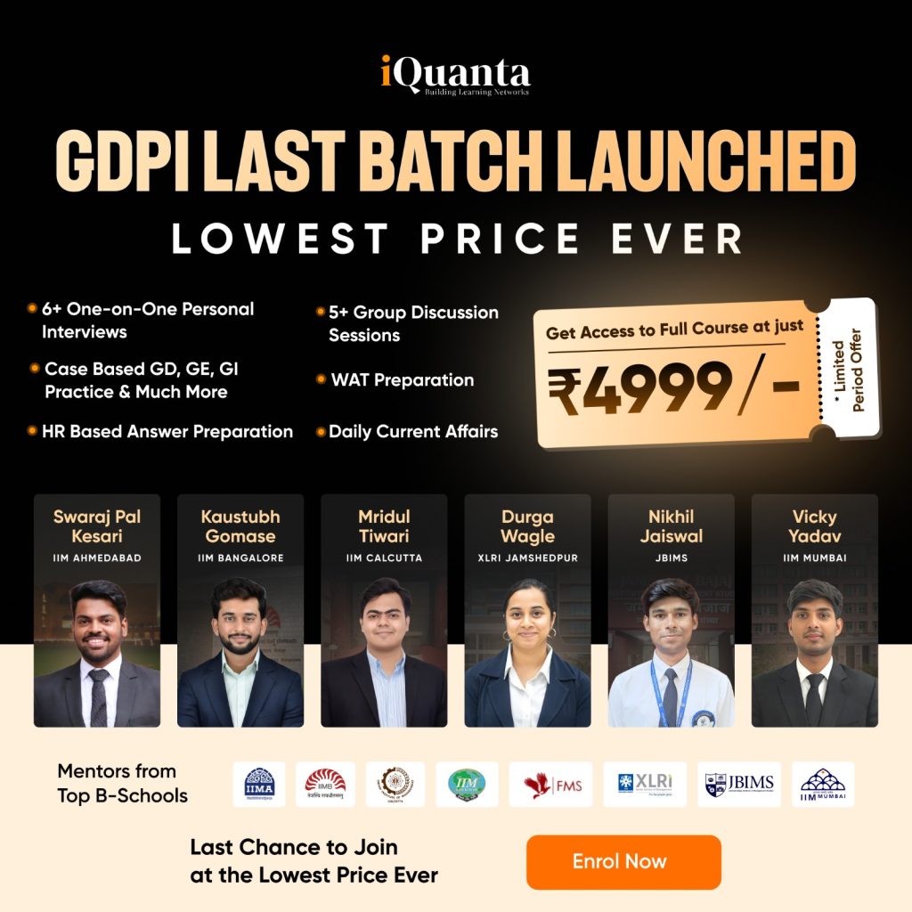 Low academics cannot stop you from succeeding. The right approach can turn your weakness into a strength. All you need is clarity and confidence. Focus on improving your general awareness and communication skills. iQuanta’s GDPI course is designed exactly for this. It offers GD & PI sessions, GK, case studies, sample mock videos, etc. You will receive detailed feedback after every session. This helps you practise real-time GD and PI scenarios. So, why wait any longer? Join the iQuanta GDPI course and maximise your chances of success.