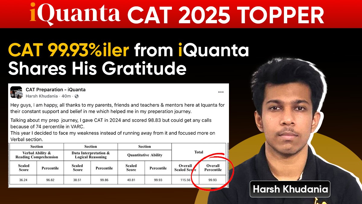 This blog covers the CAT topper journey of Harsh Khudania who scored 99.93%ile along with what are the challenges faced by him and how iQuanta helped him during CAT 2025 preparation. Let’s discuss the journey in his own words.
