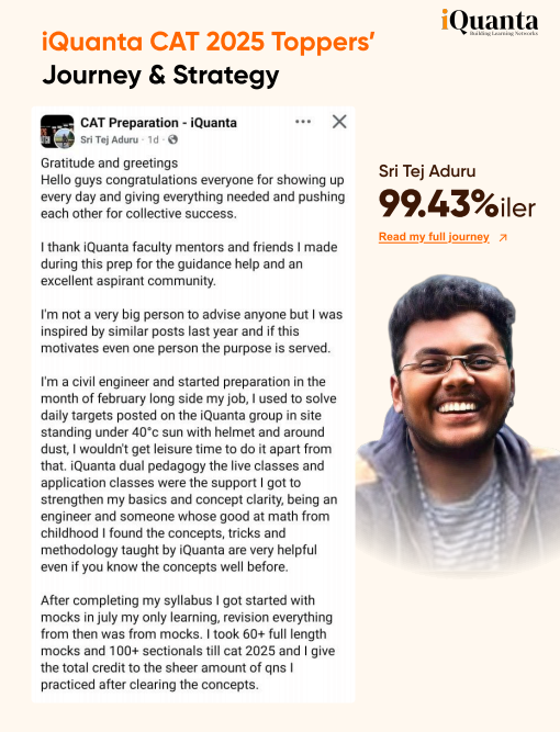 CAT Topper 2025 – Sri Tej Aduru (99.43%iler); iQuanta Student