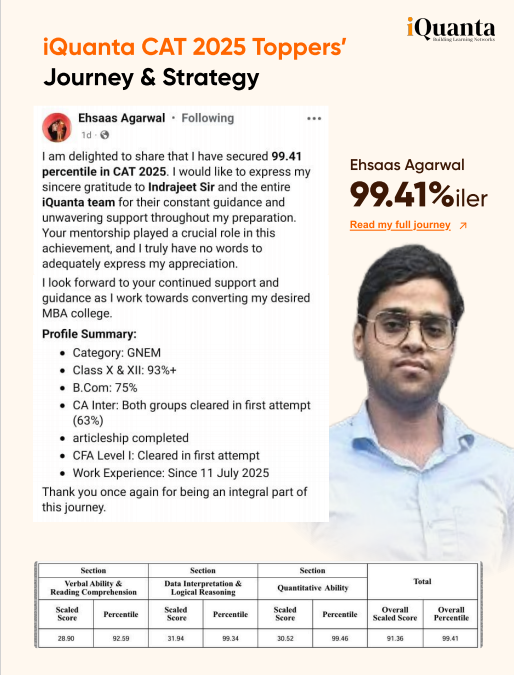 CAT Topper 2025 – Ehsaas Agarwal (99.41%iler); iQuanta Student