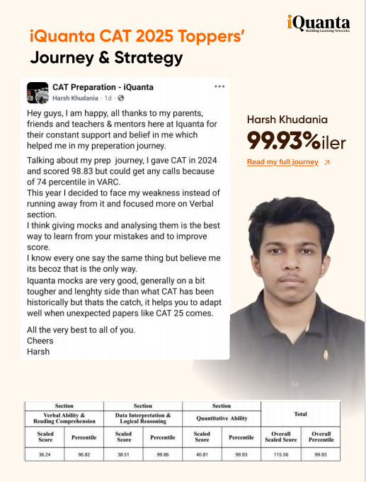 CAT Topper 2025 – Harsh Khudania (99.93%iler); iQuanta Student